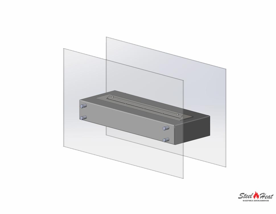 Топливный блок устанавливают в сферический корпус. Огонь может ограждаться закаленным стеклом. В зависимости от модели биокамин крепится с одной или с двух сторон.