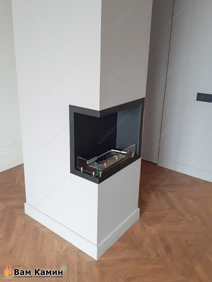 Благодаря тому, что это - угловой биокамин, защитное закаленное стекло расположено с двух сторон. Оно защищает от прямого огня и служит интересным декоративным элементом, который делает биокамин в гостиной по-настоящему незаменимым.