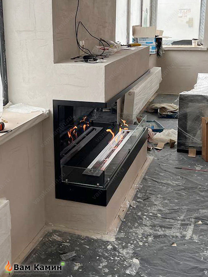 К сожалению на этапе чернового ремонта нельзя как следует увидеть, как будет сочетаться такой биокамин с окружающим интерьером. Но уже сейчас очевидно, что его строгий черный цвет заметно выделяется на общем фоне.