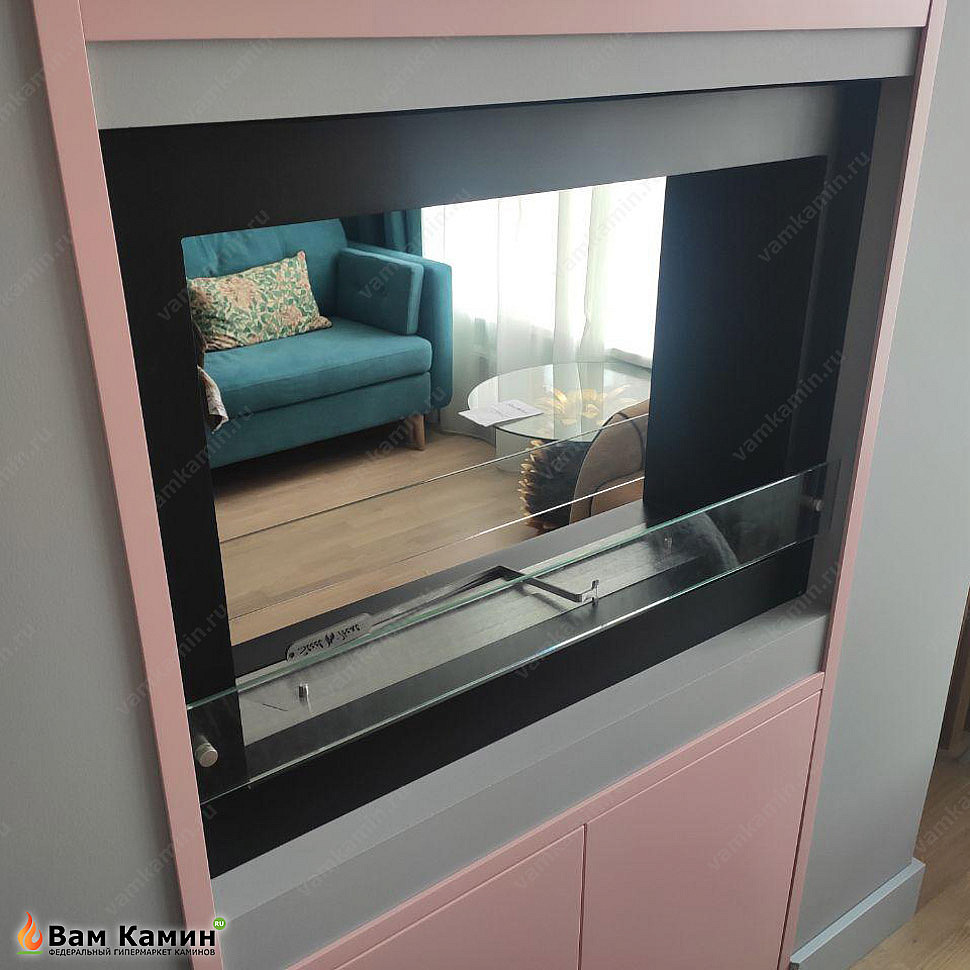 Биокамин сквозной SteelHeat ONE 800 послужил прототипом для заказного биокамина на фото. Экокамин создавался по индивидуальным размерам, чтобы подходить под габариты выреза в стене между комнатами. Такой сквозной биокамин в интерьере удобен тем, что он двусторонний. Поэтому после установки любоваться танцующими языками пламени можно одновременно из двух комнат.