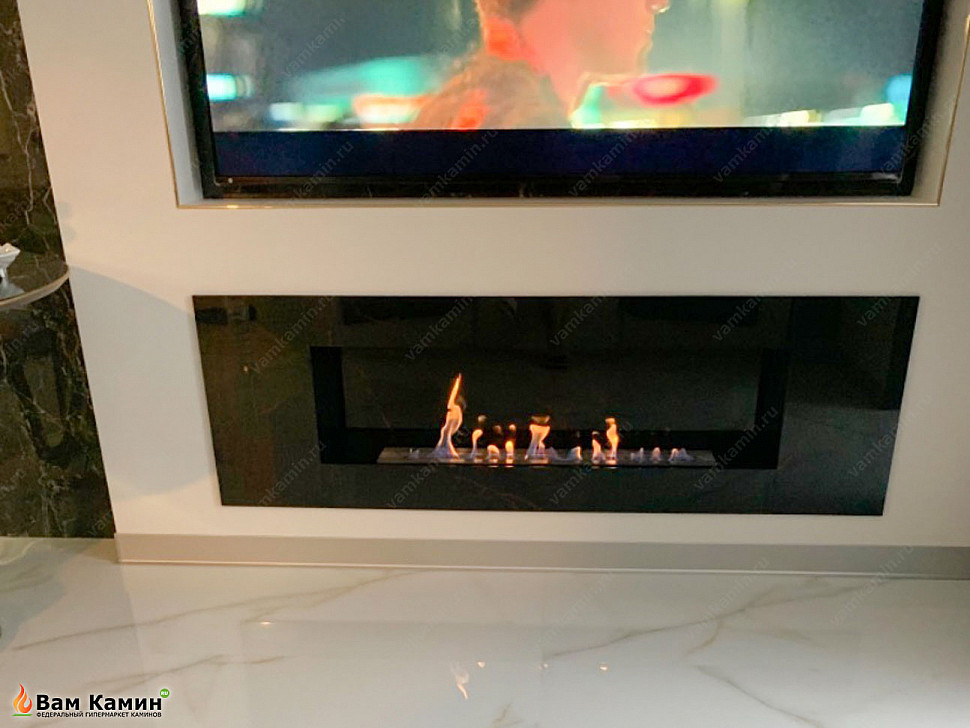 Для удобства управления огнем сверху топливный блок SteelHeat S-LINE 800 содержит в своей конструкции металлическую задвижку с толщиной 4 мм. Идея хозяев расположить биокамин в нише под ТВ-экраном увенчалась успехом благодаря добавлению к очагу топливного блока производства SteelHeat. Теперь вся семья, собравшись возле ТВ, может буквально почувствовать тепло домашнего очага.